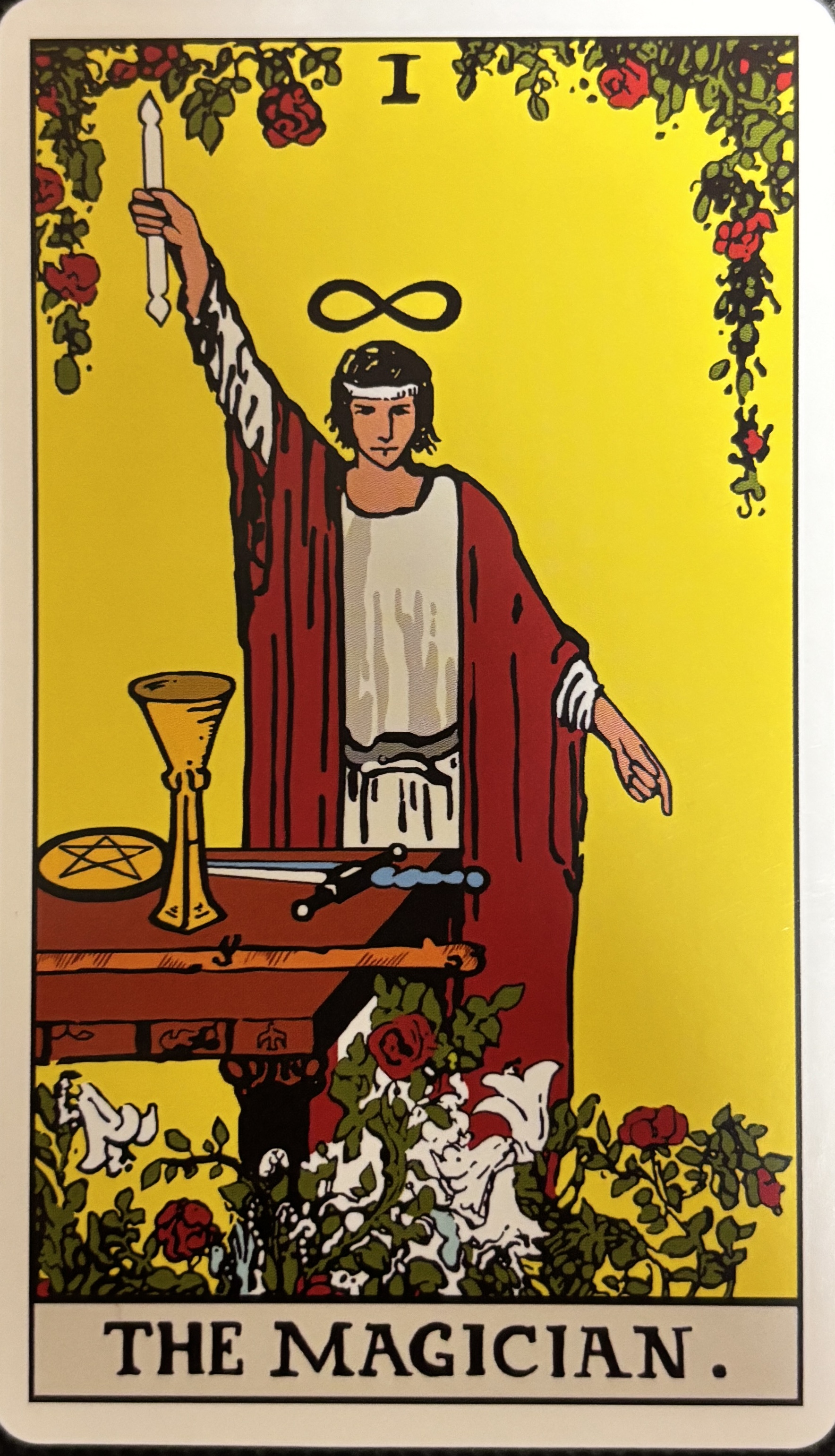 한 젊은이가 마법사 복장을 하고 자신감이 넘치는 미소를 짓고 있다. 그의 머리 위에는 영원의 상징인 뫼비우스의 띠가 있으며, 그의 허리에는 우로보로스(자신의 꼬리를 물고 있는 뱀) 모양의 허리띠가 있는데, 이것 또한 영원을 상징한다. 젊은이의 오른손은 하늘을 향해 완즈를 높이 들고 있고, 왼손은 땅을 가리키고 있다. 이것 은신의 은총이 지상으로 내려오는 천국의 보상을 뜻하며, 그것에 대한 증인으로 대지를 부른다는 의미이다. 즉, 위의 것을 끌어내리고 밑의 것을 끌어올리는 것을 의미한다. 그는 붉고 흰 옷을 걸치고 있고, 발밑에는 붉은 장미와 흰 백합들이 어우러져 있는데, 이것은 열정과 순수함을 나타내는 것이다. 아서 에드워드 웨이트는 이것들이 플로스 캄피(flos campi - 샤론의 장미)와 릴리움 콘벨리움(ilium convallium - 골짜기의 백합화)을 나타낸다고 하였다. ‘플로스 캄피’(샤론의 장미) 란영광스러운 땅에 핀 꽃을 뜻하고,‘릴리움 콘벨리움’(골짜기의 백합화)은 누구나 쉽게 접할 수 있고 바라볼 수 있는 모두를 위한 것이라는 뜻을 나타낸다.